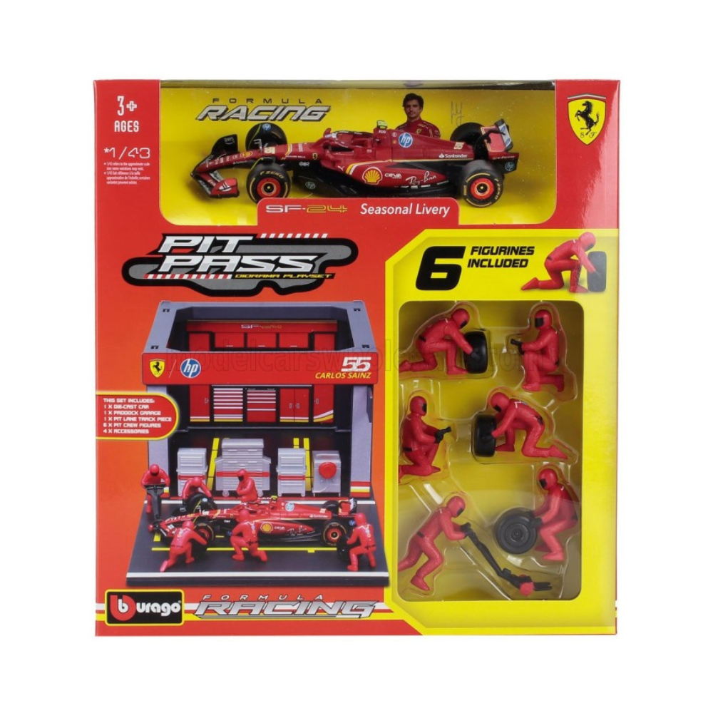 1/43 scale diecast F1 miniature of the Ferrari SF24 Diorama Garage Pit-Stop #55 driven by Carlos Sainz during the 2024 Formula 1 season. Bburago model car 18-36862-S. Bburago 2025 Miniature Car Catalog. Collectible model car.