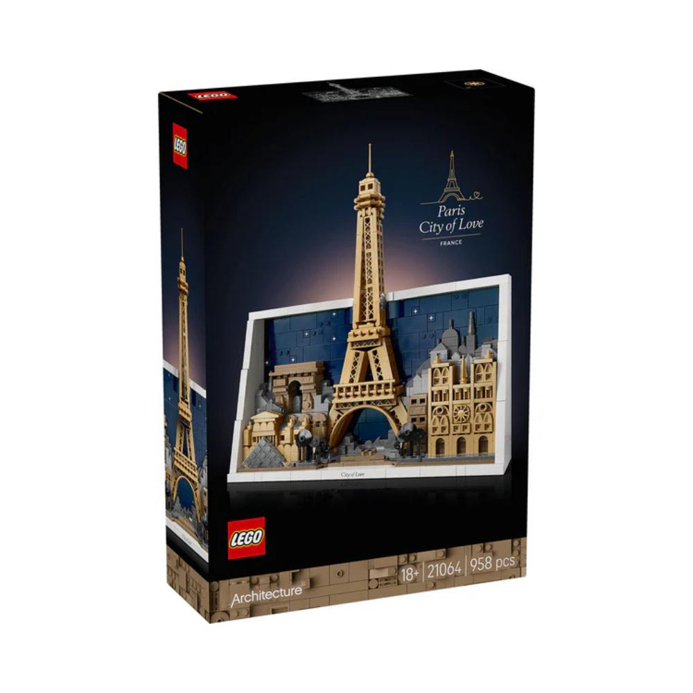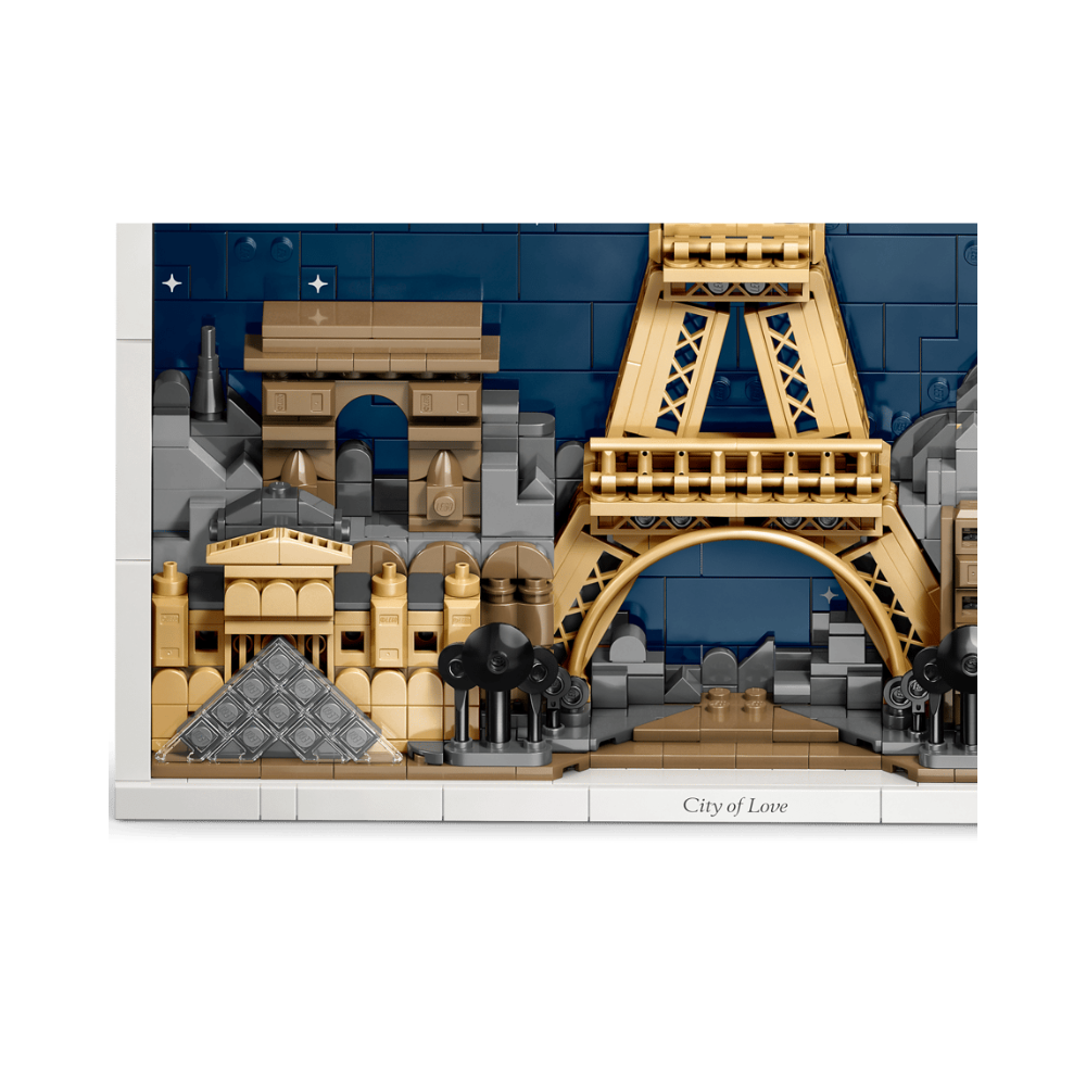 EXPLORE PARIS IN DETAIL – This detailed LEGO® home decor set of Paris – City of Love (21064) features 4 Paris architecture icons amid a city background and sky full of stars, framed in white bricks