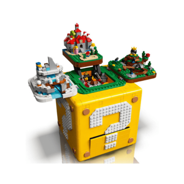 - The ? Block measures over 7 in. (18cm) high, wide and deep, and opens to reveal 4 detailed Super Mario 64 levels: Peach’s Castle, Bob-omb Battlefield, Cool, Cool Mountain and Lethal Lava Trouble.