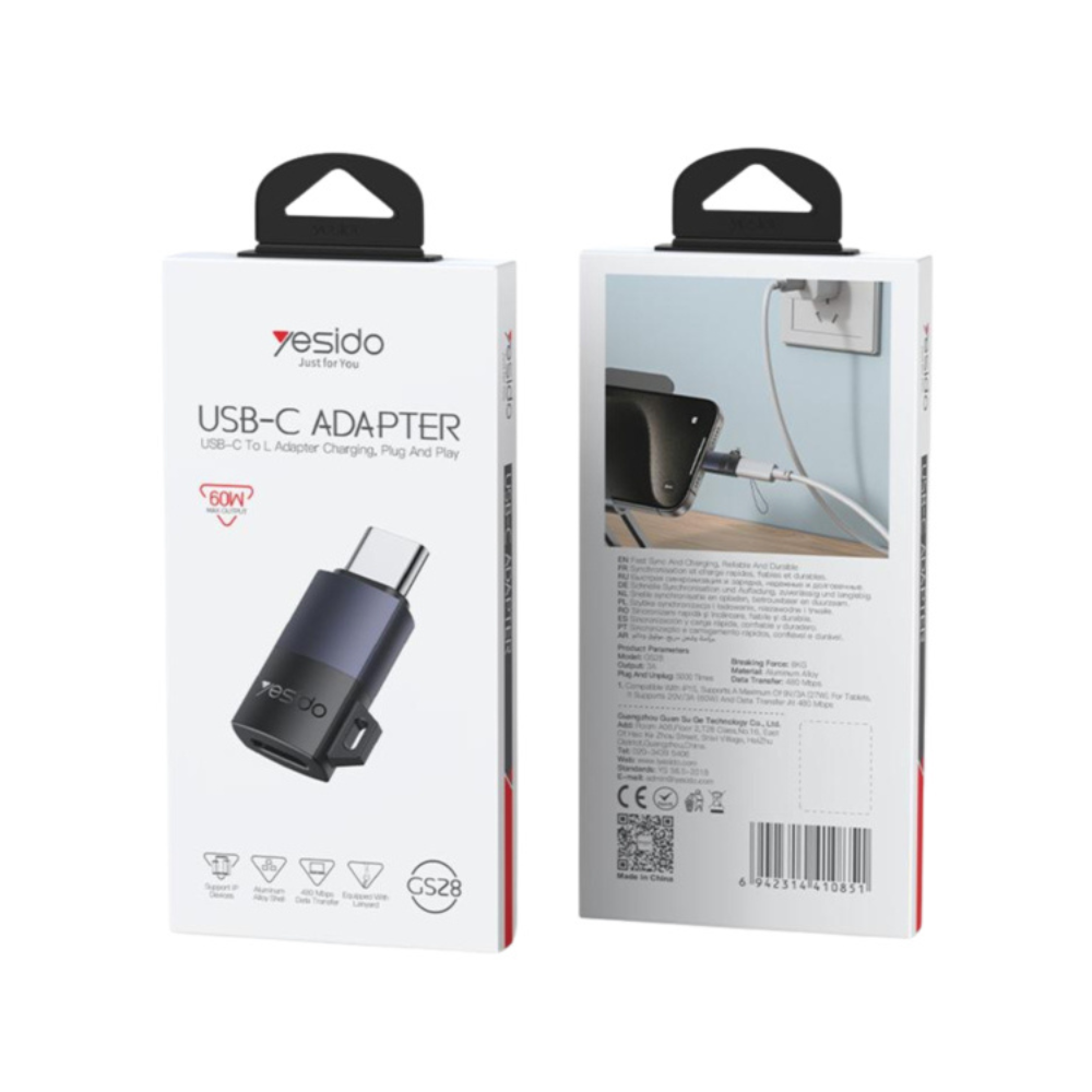 The Yesido GS28 Type-C to Lightning Adapter is your go-to solution for charging and syncing Apple devices using a USB-C cable. With 60W fast charging, 480Mbps data transfer, and a durable alloy shell, it’s built for performance and portability. Whether you’re connecting to a MacBook, power bank, or Android phone with Type-C output, this OTG adapter ensures seamless compatibility with Lightning devices—no drivers or apps required.